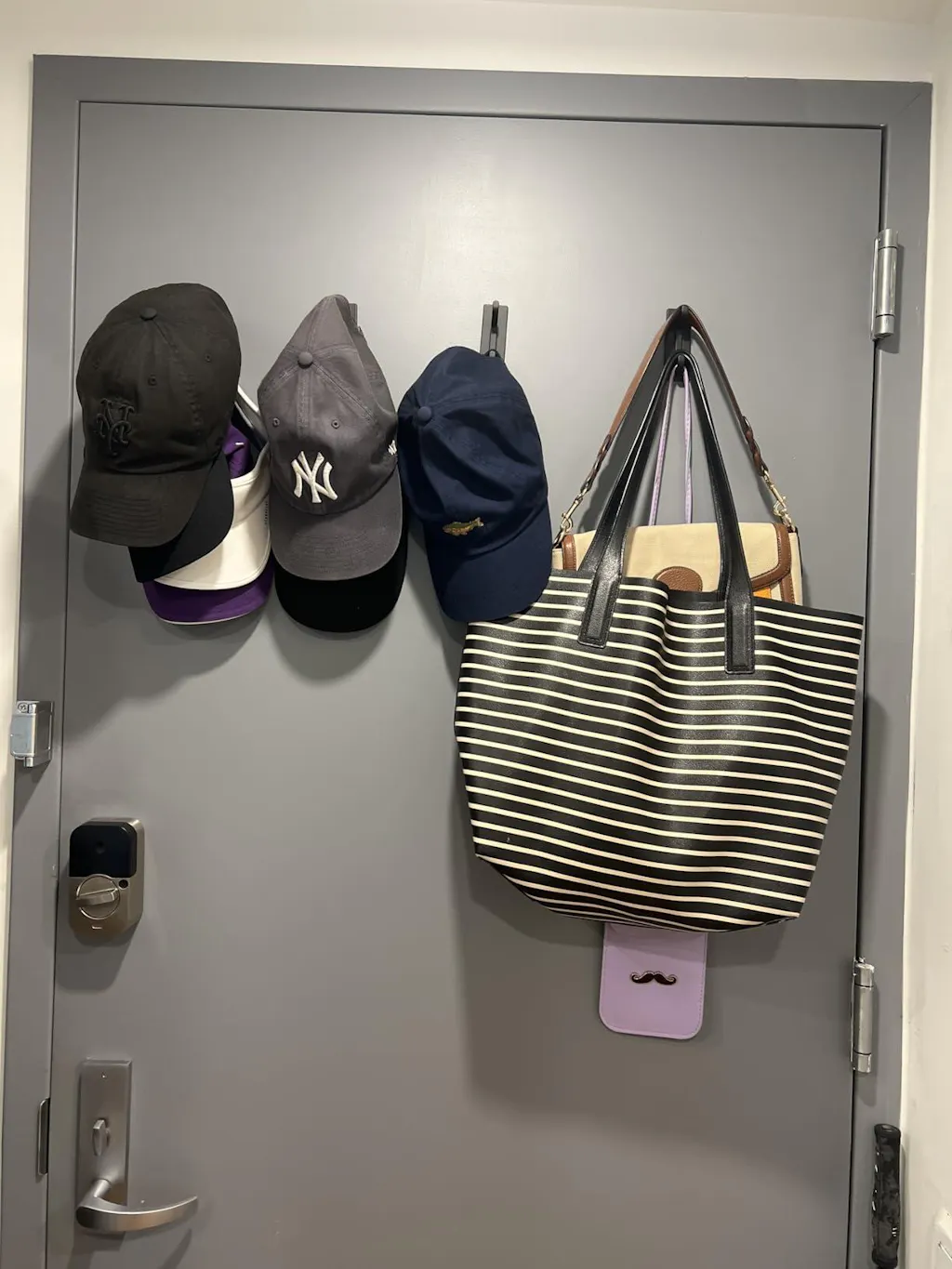 I installed these hooks on the back of the door to hang bags and coats. They stick very securely and make the room look tidier.
